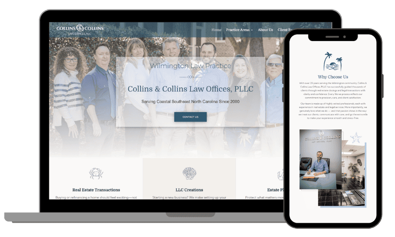 The website for Collins & Collins Law blends professionalism with a welcoming coastal aesthetic, reflecting the firm’s Wilmington roots. Inspired by beach tones, we incorporated a calming color palette of soft blues, sandy neutrals, and ocean-inspired accents to convey trust, clarity, and approachability. The layout is clean and intuitive, making it easy for clients to navigate services, schedule consultations, and learn more about the firm’s legal expertise.