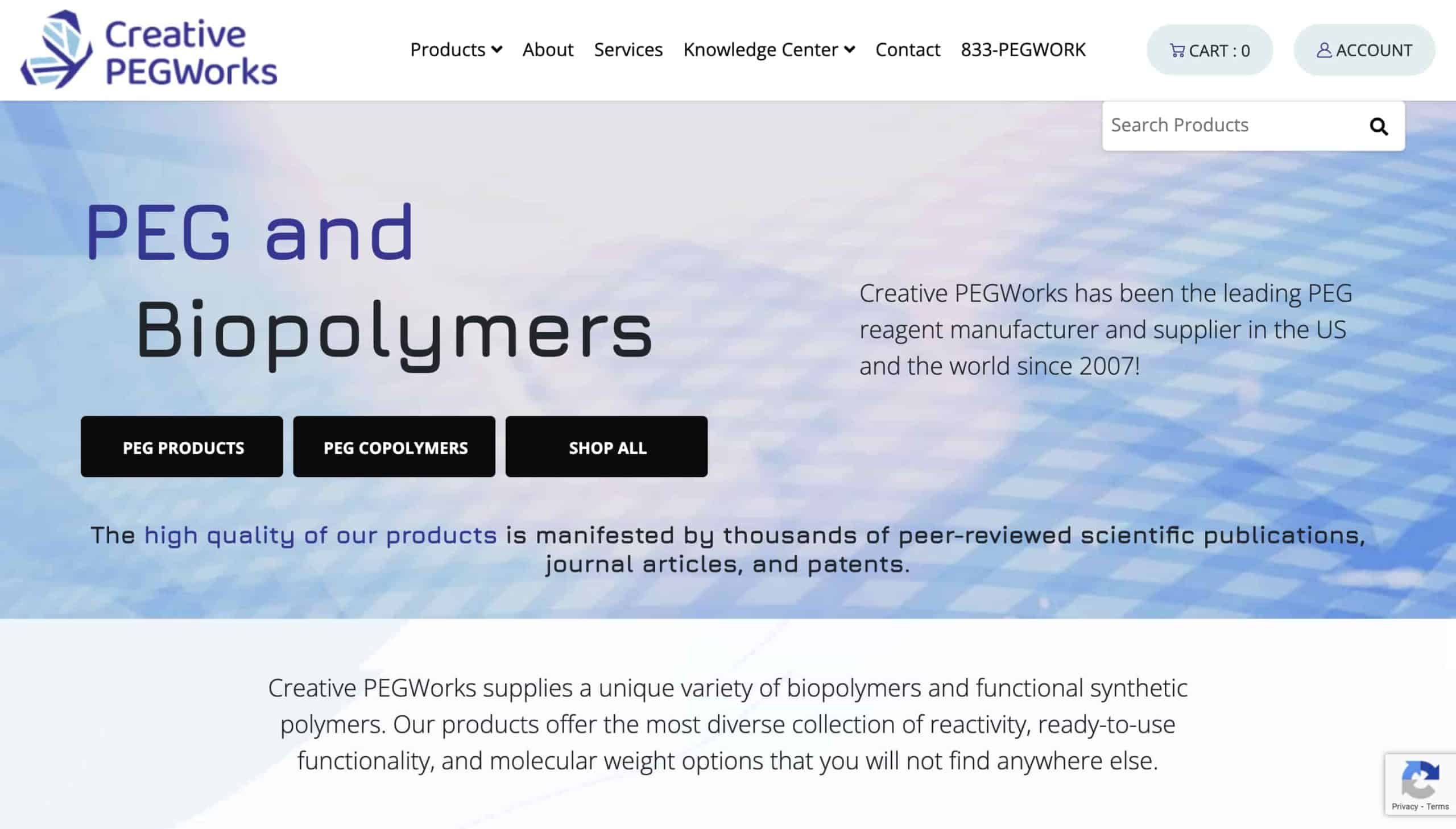 Creative PEGWorks is a biotechnology company located in the Research Triangle Park of North Carolina with a core business to innovate, manufacture and supply advanced functional polymer products. Creative PEGWorks approached TheeDigital with the goal of updating its digital footprint across the web - and that started with redesigning a custom website that could strategically drive high-value leads and foster partnerships with its niche, technical audience.