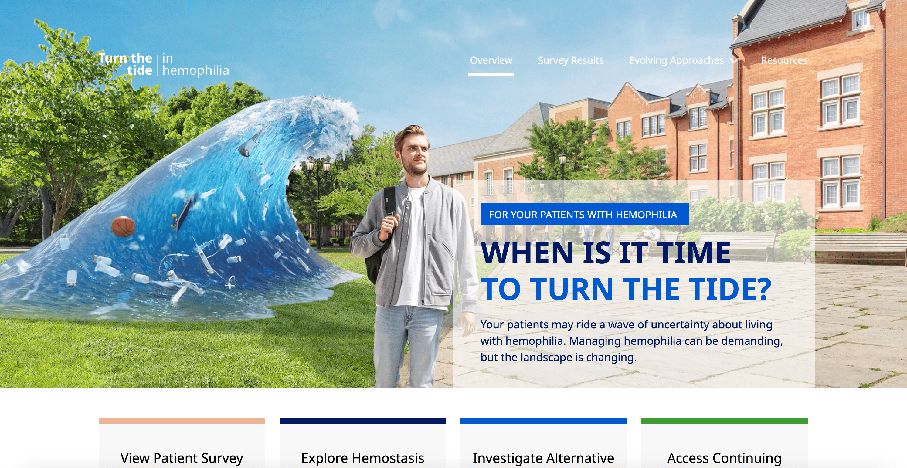 § With "TurnTheTideInHemophilia.com", we shared new insights into the reality of patient's lives, in a clean, easy to navigate, and engaging interface that focuses on what Healthcare Providers are most interested in: the data. This new research showed that, while hemophilia treatments have improved significantly over the years, there is still a lot of opportunity better address the pain points of living with the disease.